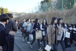 本校の生徒全員で花道を作り、泳薫高校の生徒たちを歓迎しました。